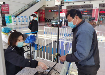 進(jìn)站口,車(chē)站的工作人員嚴(yán)格佩戴口罩,手套,正對(duì)進(jìn)站乘車(chē)的旅客進(jìn)行體溫、健康碼、身份證等的檢查。