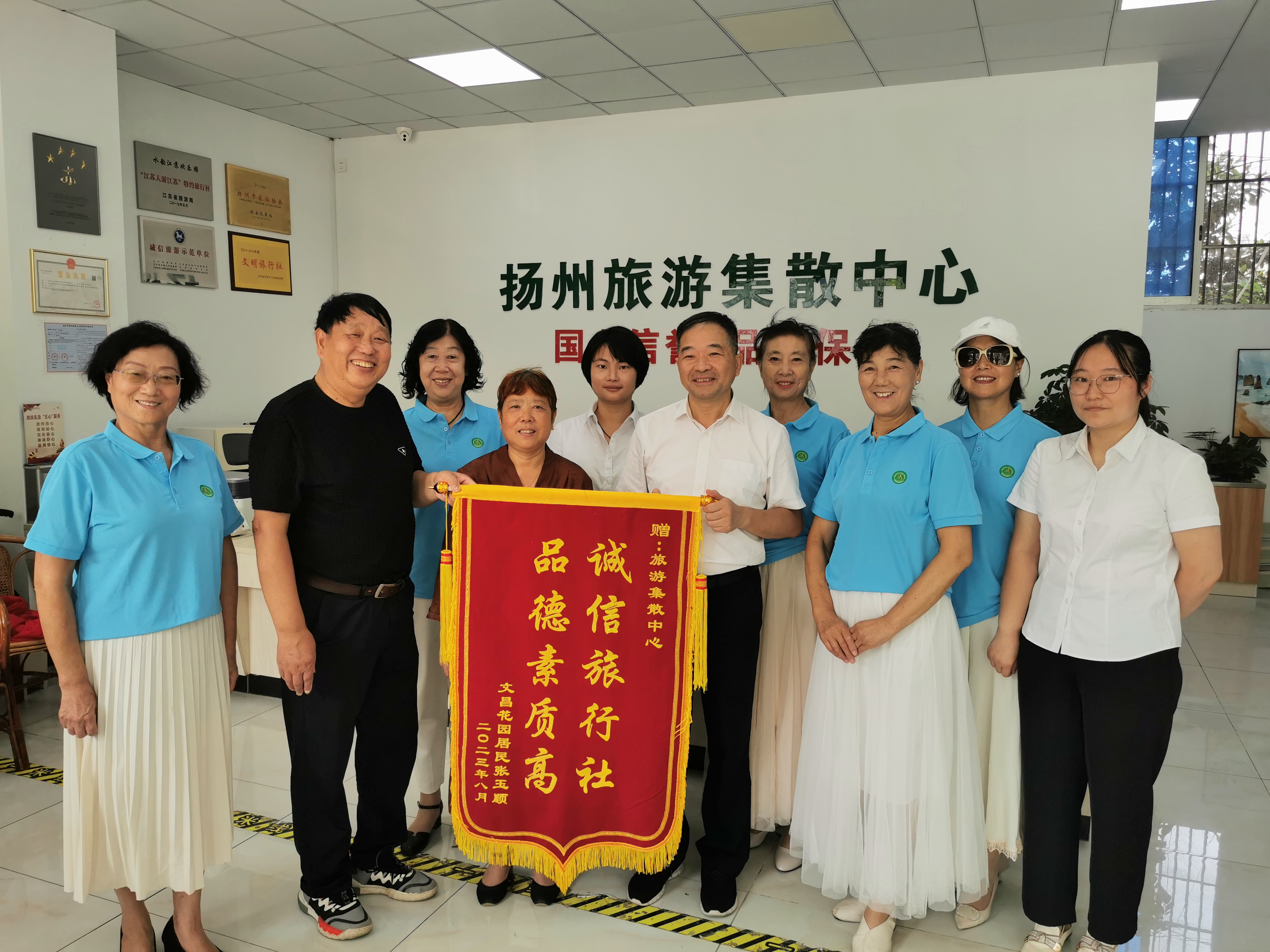 揚(yáng)州旅游集散中心始終堅(jiān)信只有真誠(chéng)細(xì)致的服務(wù),才會(huì)讓旅行更有溫度。“誠(chéng)信旅行社,品德素質(zhì)高”、“真心為民服務(wù)、傾心替民解憂”這兩面紅底金色的錦旗承載著游客對(duì)集散中心的認(rèn)可,凝聚著彼此之間真情與感恩,激勵(lì)職工不斷提升業(yè)務(wù)能力,時(shí)刻為游客解憂,樹公司品牌!
