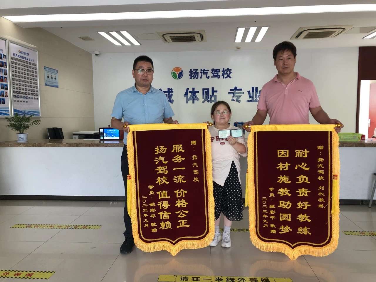 9月27日上午,在揚(yáng)汽駕校西部樞紐招生大廳內(nèi),昨天剛?cè)〉肅2駕照的學(xué)員姚彩平,將“服務(wù)一流、價(jià)格公正、揚(yáng)汽駕校、值得信賴”、“耐心負(fù)責(zé)好教練、因材施教助圓夢”兩面錦旗送到了揚(yáng)汽駕校主任顧軍和她的教練劉權(quán)的手上,感謝駕校工作人員和教練在她學(xué)車期間的認(rèn)真教學(xué)、辛苦付出。