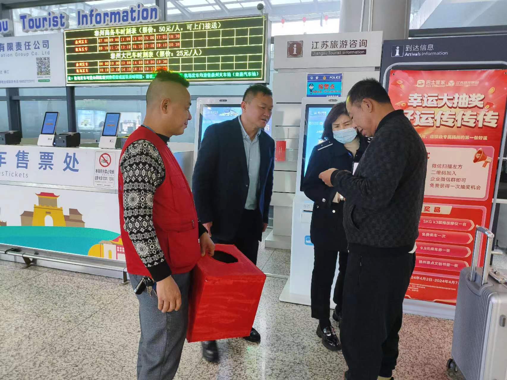 為更好地增強(qiáng)與旅客之間的互動(dòng)和交流,拉進(jìn)企業(yè)與旅客的距離,進(jìn)一步向廣大旅客宣傳揚(yáng)泰機(jī)場定制專線的運(yùn)營模式,4月2日,集團(tuán)揚(yáng)泰機(jī)場定制專線在揚(yáng)泰機(jī)場組織開展“幸運(yùn)大抽獎(jiǎng),好運(yùn)傳傳傳”機(jī)場旅客現(xiàn)場抽獎(jiǎng)活動(dòng)。